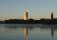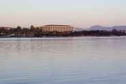 as seen from across a serene Lake Burley Griffin