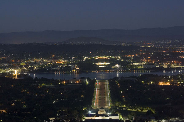 The War Memorial is in the immediate foreground, and the runway type road points across the lake to Old Parliament House(brightly lit) and behind it; New Parliament House