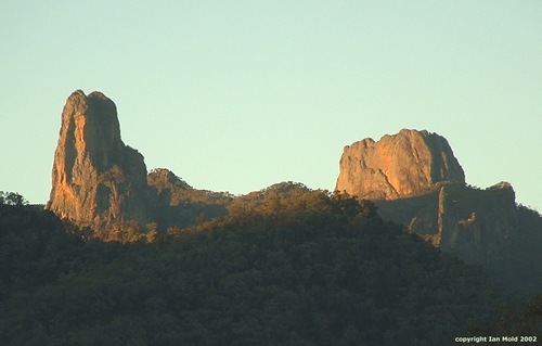 "dawn on Belougery Spire, the Breadknife and Bluff