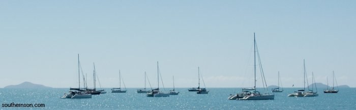 more yachts on a calm day photographed from Airlie Beach (Whitsunday Islands in background)