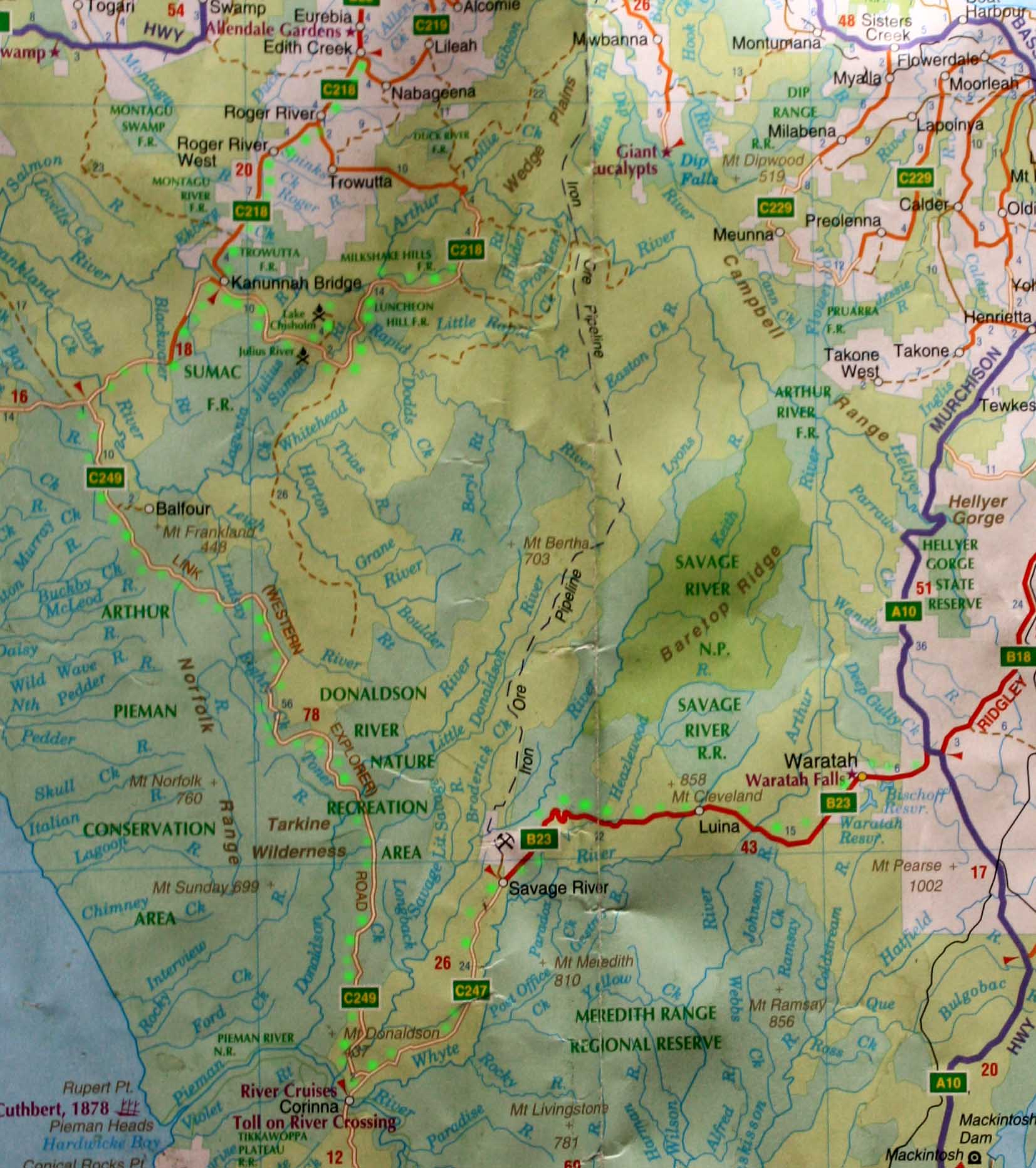 NOTE: the light green dots indicate the trip I took through the Tarkine (from North to South)